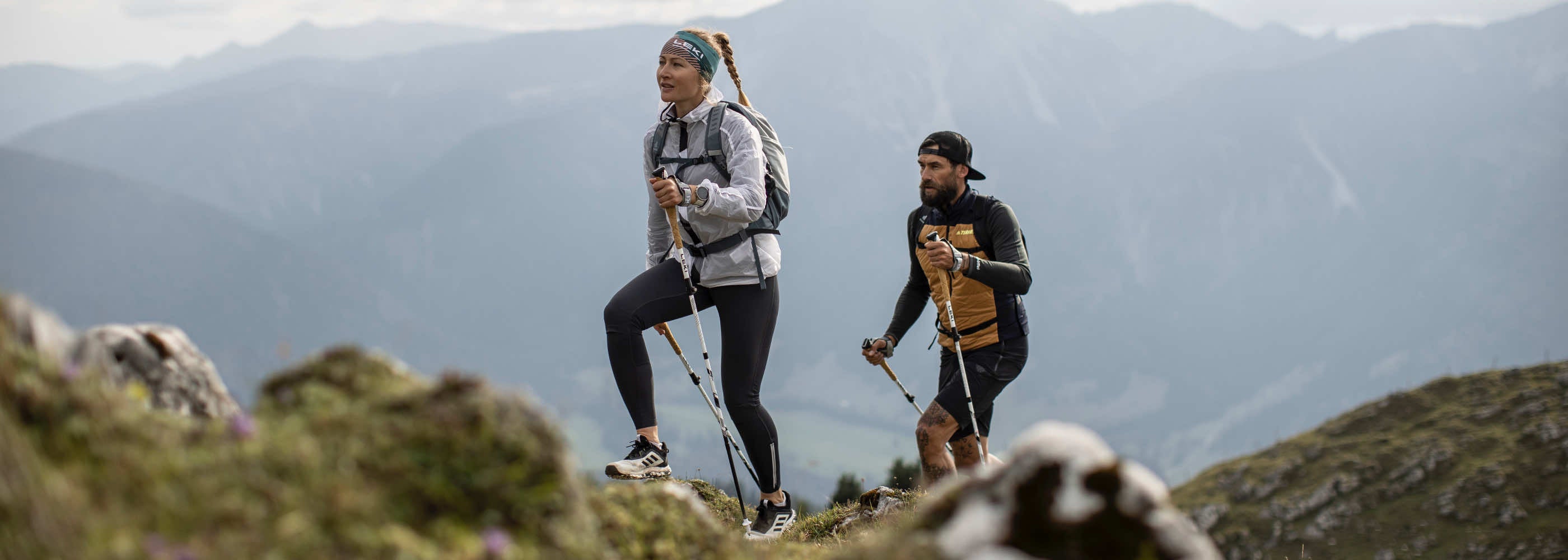 Cross trail poles are extremely light and extremely flexible. They help you move quickly and efficiently on the mountain. With poles, your muscles use less energy per step, which increases performance. In addition, the weight distribution on arms and legs relieves the entire musculoskeletal system. The drive from poles also provides more speed and the additional ground contact helps you in challenging terrain – especially downhill.